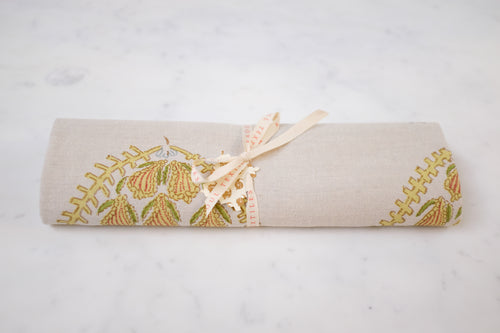 SoldA remnant of Raoul Textiles Giles Loquat Remnant on Natural linen. Hand printed in Santa Barbara, California. Great for a variety of projects!